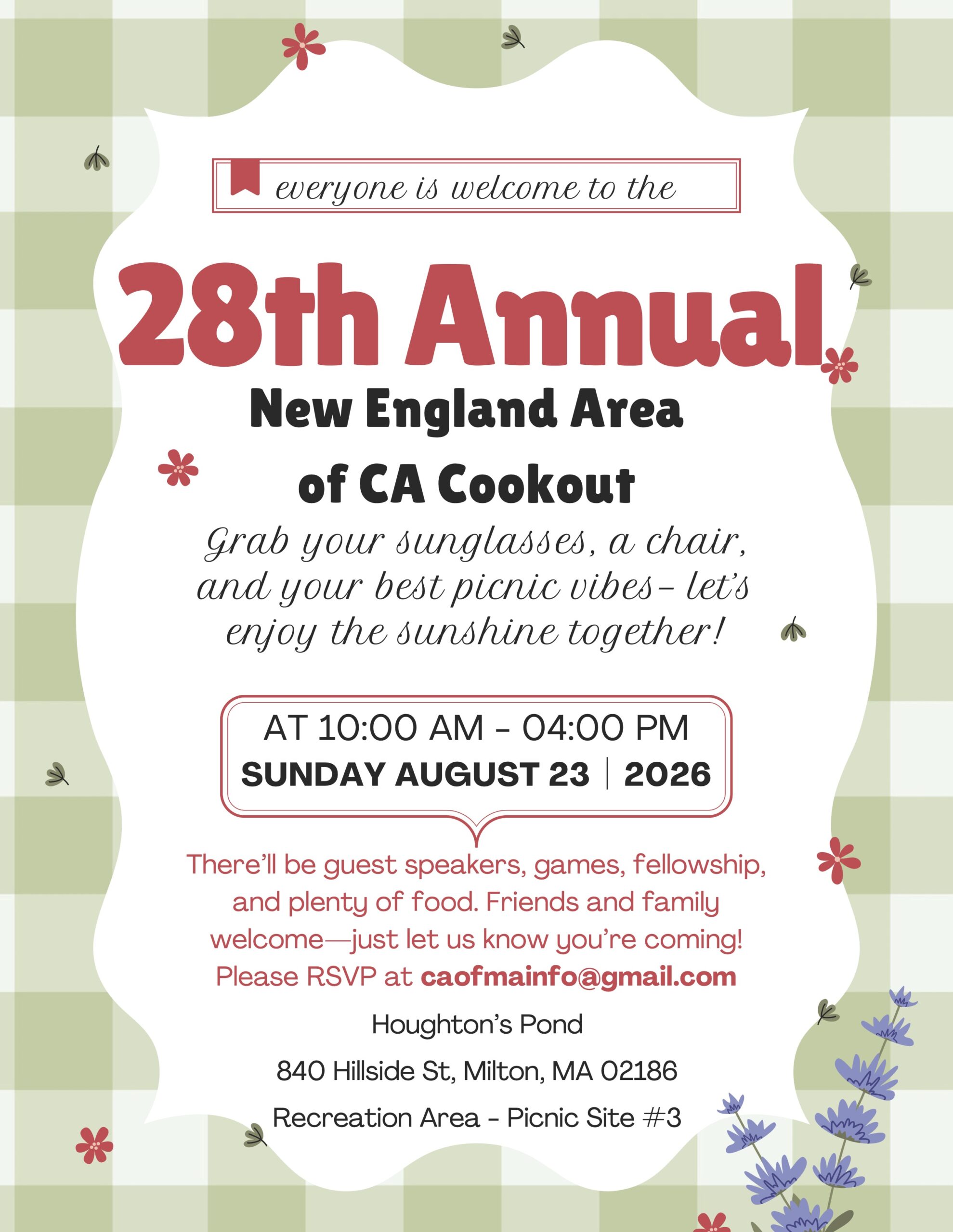 - The Andover group will be hosting the Annual MACA cookout on Sunday, 8/23 at Houghton’s Pond Recreation Area Picnic Site #3 in Milton, MA. Please attend our next business meeting on 4/28 or the following business meeting 6/30 to volunteer to help coordinate this event!